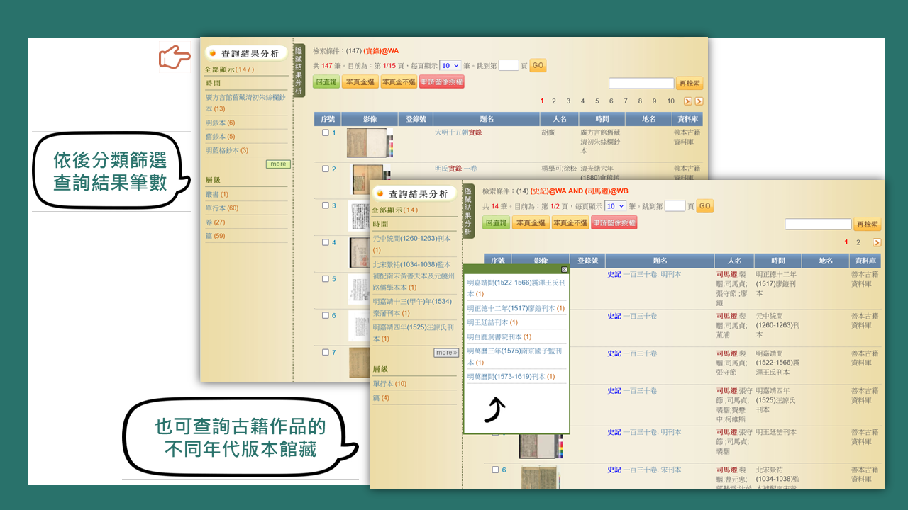 📌在第二個範例中,我們在題名欄位輸入「史記」、作者欄位輸入「司馬遷」進行查詢,就能透過檢索結果的後分類,觀察到《史記》這部作品在資料庫中涵蓋的不同版本館藏。