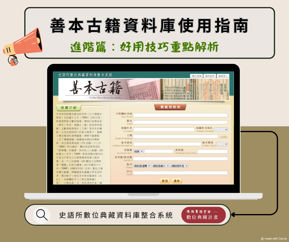 【善本古籍資料庫使用指南】(上)新手篇Part 1~Part 5:連結在此👉 https://dap.ihp.sinica.edu.tw/topic/27/